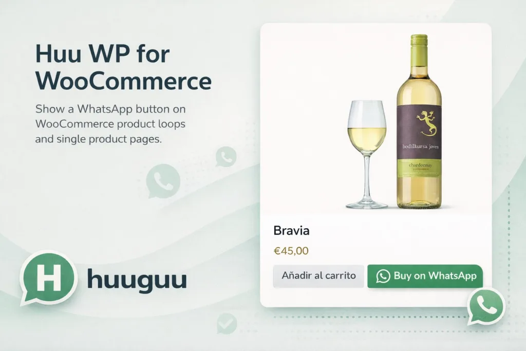 Huu WP for WooCommerce añade un botón de WhatsApp en las páginas de producto y en los listados de WooCommerce. Con un solo clic, los clientes pueden iniciar una conversación sobre el producto que están viendo, facilitando resolver…